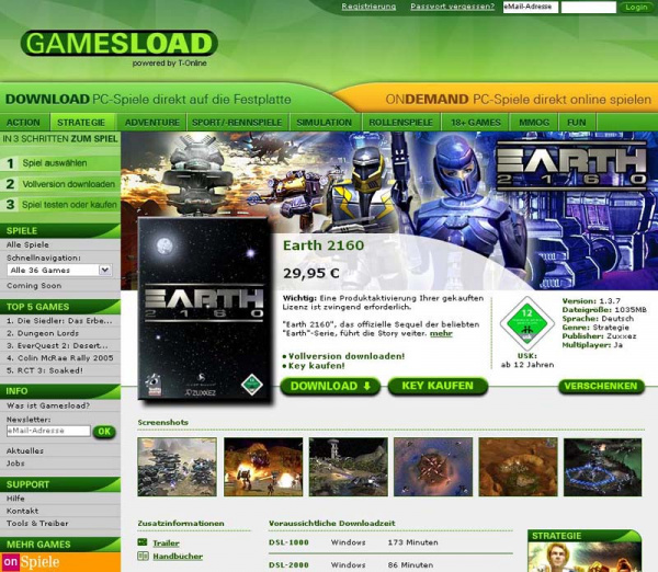 Schnäppchenjäger aufgepasst! ZUXXEZ Entertainment AG vertreibt das Echzeitstrategiespiel „Earth 2160“ ab sofort auch übers Internet. In Kooperation mit der neuen Downloadplattform Gamesload von T-Online ist der Charttitel für nur 29,95 Euro zu haben. Aufgrund des günstigen Preises bietet sich das Onlineangebot auch für Multiplayerrunden an, die mehr Seriennummern für ihre Gefechte benötigen, aber nur ein Originalspiel zur Verfügung haben.