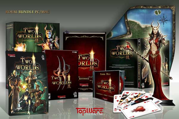 Wer als Jäger und Sammler von Raritäten für die Zukunft vorsorgen will, hat beim Release von „Two Worlds II“ im Frühjahr 2010 die Qual der Wahl. Der Rollenspielhit erscheint nämlich in Europa auf allen Plattformen in jeweils drei Versionen und läutet damit ein neues Servicezeitalter in den Verkaufsregalen ein. Prunkstück des TWII-Triumvirats ist das Royal Bundle, dem als Highlight eine rund 25cm große, hochwertig verarbeitete Dragon-Queen-Sammlerfigur beiliegt. In der Box sind zusätzlich ein 64-seitiges Artbook, eine Bonus-DVD, ein 55-Blatt-Kartenspiel, drei exklusive In-Game-Items plus Exklusivquest, ein Mousepad (nur PC Version) sowie natürlich das Spiel (multilingual) selbst inklusive Handbuch und Wendeposter mit Antaloor-Weltkarte. Die empfohlenen Verkaufspreise für das Royal Bundle liegen bei 69,99 Euro (PC/Mac), 79,99 Euro (Xbox 360) und 89,99 Euro (PS3).