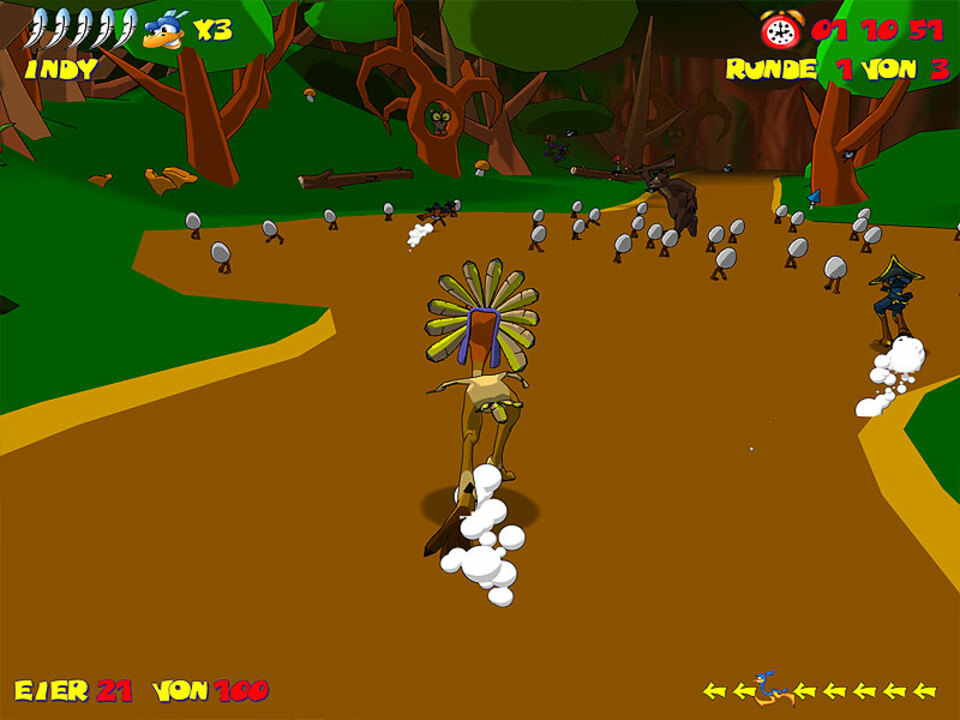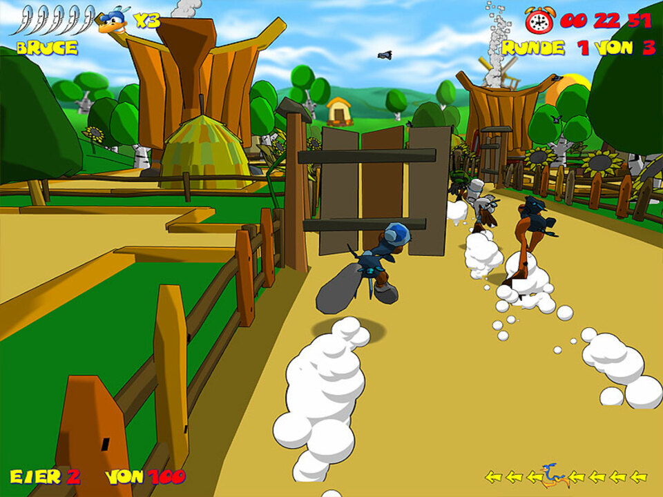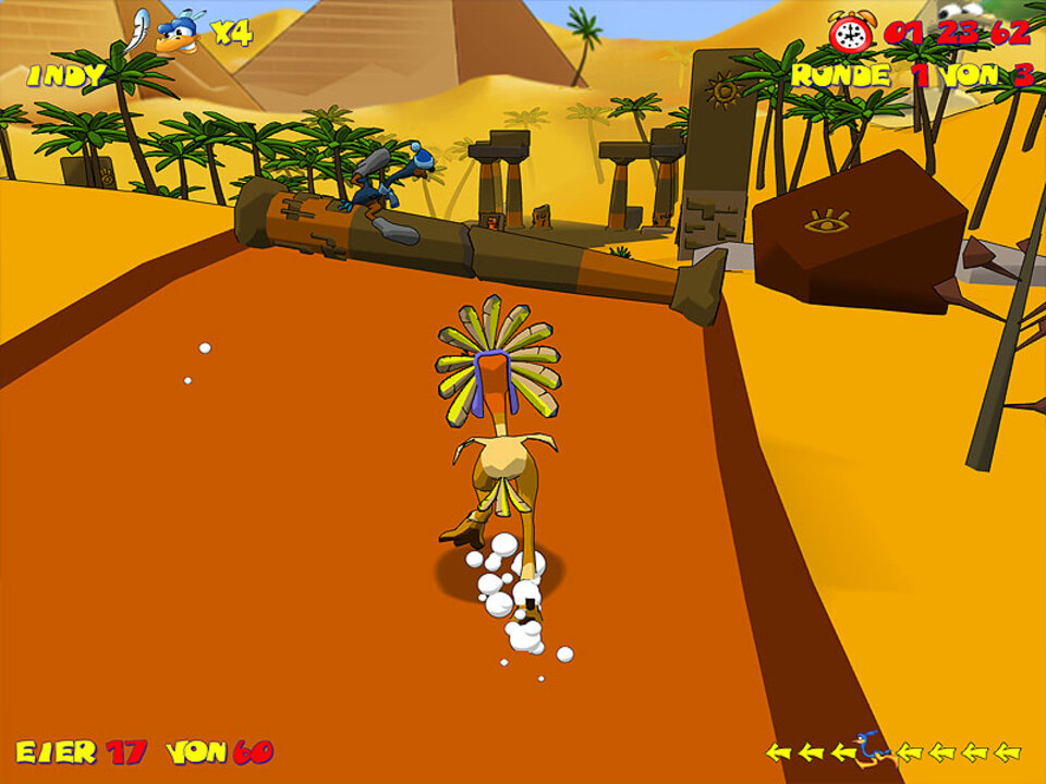 Die liebevoll animierten Charaktere setzen mit unvergleichlicher Grazie über die verschiedensten Hindernisse hinweg. Dabei strotzen die zehn Spielwelten nur so vor witzigen Details. Wirbeln Sie Staub auf, dass die Federn nur so fliegen. Und wenn sich alles dreht, dann haben Sie vermutlich eine fliegende Melone abbekommen. Bei der Musik herrscht akute Ohrwurmgefahr. Je nach Rennstrecke erklingen unterschiedliche Audio-Files. Alleine gegen sieben vom Rechner gesteuerte Gegner, zu zweit an einem PC oder gegen vier Gegner im Netzwerk sowie LAN: Egal welchen Modus sie spielen, es kommt auf Schnelligkeit und Geschicklichkeit an. Laufen sie als Erster über die Ziellinie und sammeln Sie unterwegs so viele Eier ein wie möglich. Eine kollisionsfreie Performance ist das A und O dieses Racers. Und noch etwas: Bleiben Sie mit Ihren Augen auf dem Weg. Trotz witziger Extras am Wegrand gilt es, die Übersicht zu behalten!